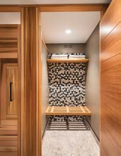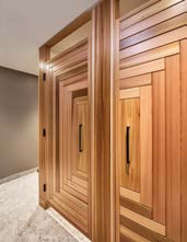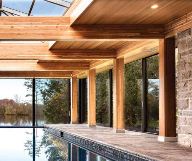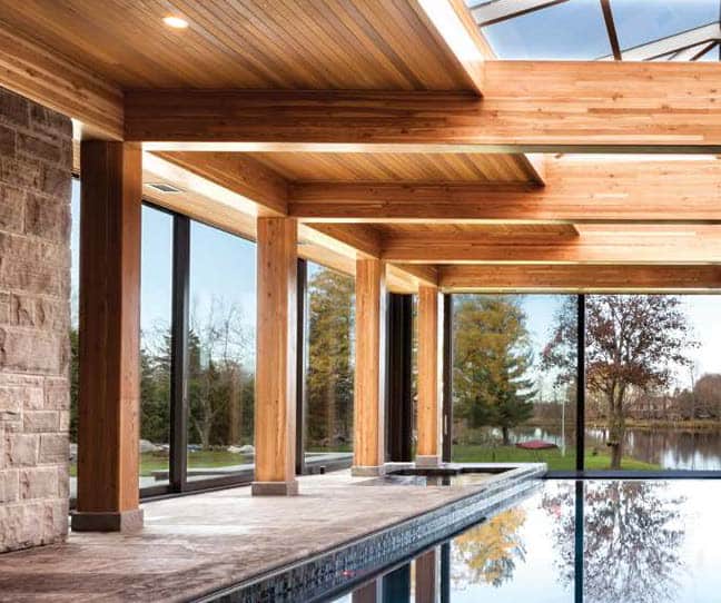 With several sitting areas boasting sublime views and five fireplaces to cozy up to, there’s much to admire. One of Malcolm’s favourite design elements, considered his signature, is a long corridor to the right of the main foyer that ends with a full-sized window, which brings the outside in. Tucked off of this corridor is an inviting indoor infinity pool and hot tub. The homeowners, who enjoy a swim several times a week, say the waterline of the pool and river match up perfectly making it feel like you are immersed in one body of water. With plenty of wow appeal, the pool area was constructed by Roger Willis Contracting Ltd., and features Douglas Fir beams, a stunning cedar ceiling and 11-foot six-inch glass doors leading to the patio. Malcolm bets the doors are the tallest of any home in Ontario and were made in Germany. Even the guest change rooms and bathroom need to be inspected as they’re decked out in a water-inspired blue-and-white hexagon tile and hefty custom wood doors in a herringbone pattern, designed by Malcolm and replicated on the home’s cedar soffit.