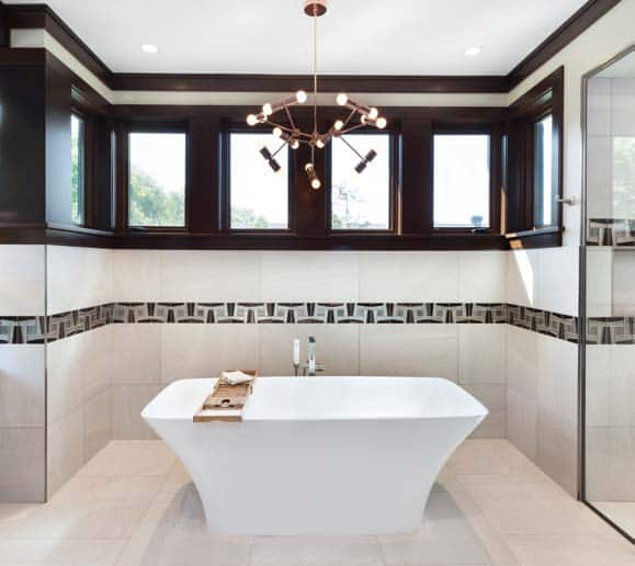 It’s easy to see why the master ensuite is one of Jason’s favourite rooms. A winner at the 2017 Greater Ottawa Home Builders Association’s Housing Design Awards for custom bathrooms, the luxurious spa room features a stand-alone soaker tub with funky overhead chandelier by Toronto’s Lightmaker Studio, backlit vanity mirrors, walk-in steam shower, hammered nickel sinks by Native Trails and a band of windows offering views of the front lawn and trees.
