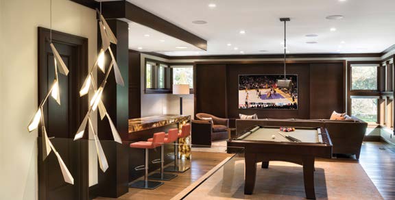 This room is game central when family and friends are over and boasts an 86-inch television, pool table and funky bar and barstools.