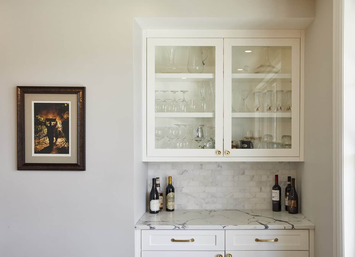 Now comfortably settled at the new address, they are happy with how their plans and teamwork have played out. On a gloomy weekday morning, they’re seated at the striking quartz-topped island in the beautiful, light-filled kitchen. “It’s so much brighter,” Chris says of this inviting space at the heart of their home. Big windows, marble subway tile and statement lighting shine in a layout that lends itself to socializing and easy indoor-outdoor living. Beside the three-season screened porch, there’s also a sizeable deck area off the kitchen.