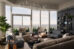 In the living room, she explains, the layering of textures provides depth and interest. “The chic velvet sectional is paired with a hand-knotted rug with a subtle pattern incorporating hues of blue and gold that seems to sparkle in the light. Organically shaped mirrors are paired to expand the space and offer reflections of the water’s edge.” Multiple seating arrangements create interest, while also providing enjoyable space for large gatherings.